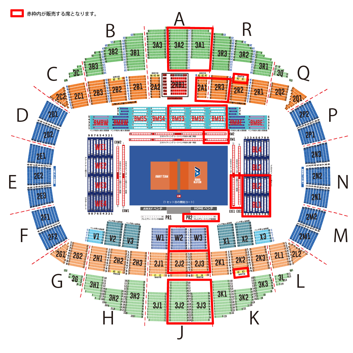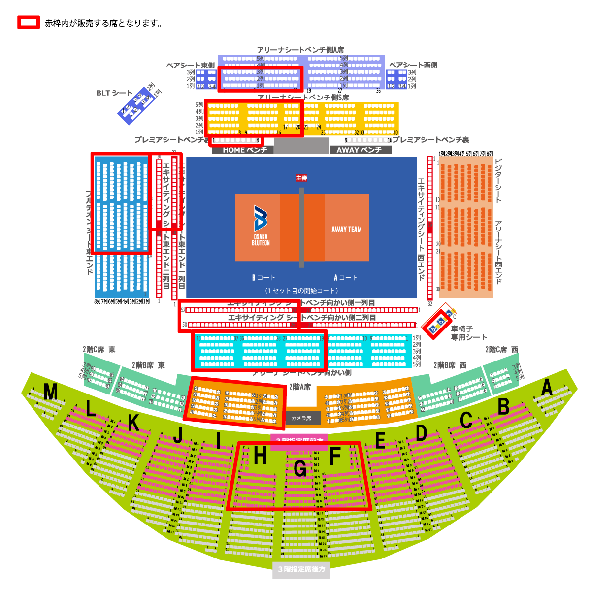 - ※販売する席はすべて「大阪ブルテオン」の応援席になります。他チームのユニフォームおよび応援グッズは身に着けることはできません。